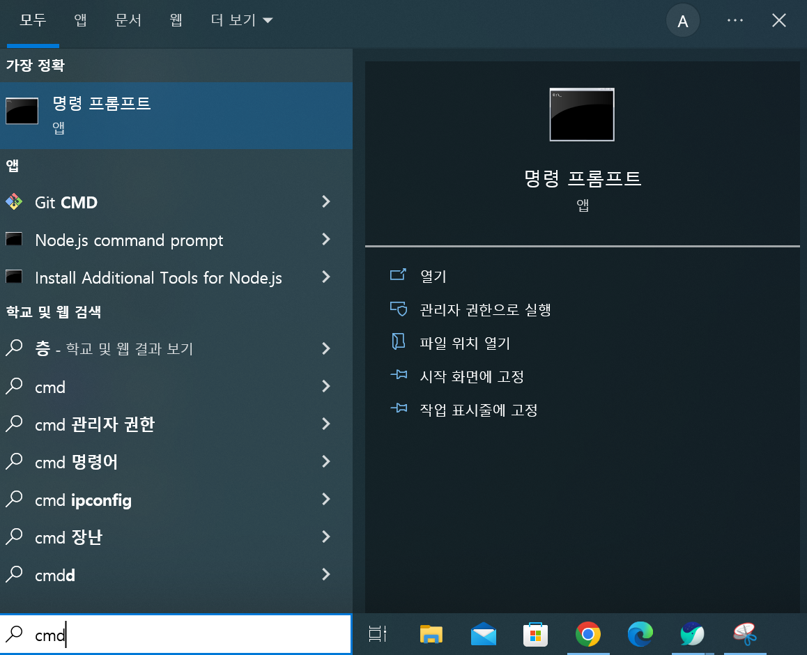 1. 윈도우 검색창에 "cmd"를 검색하고 엔터
