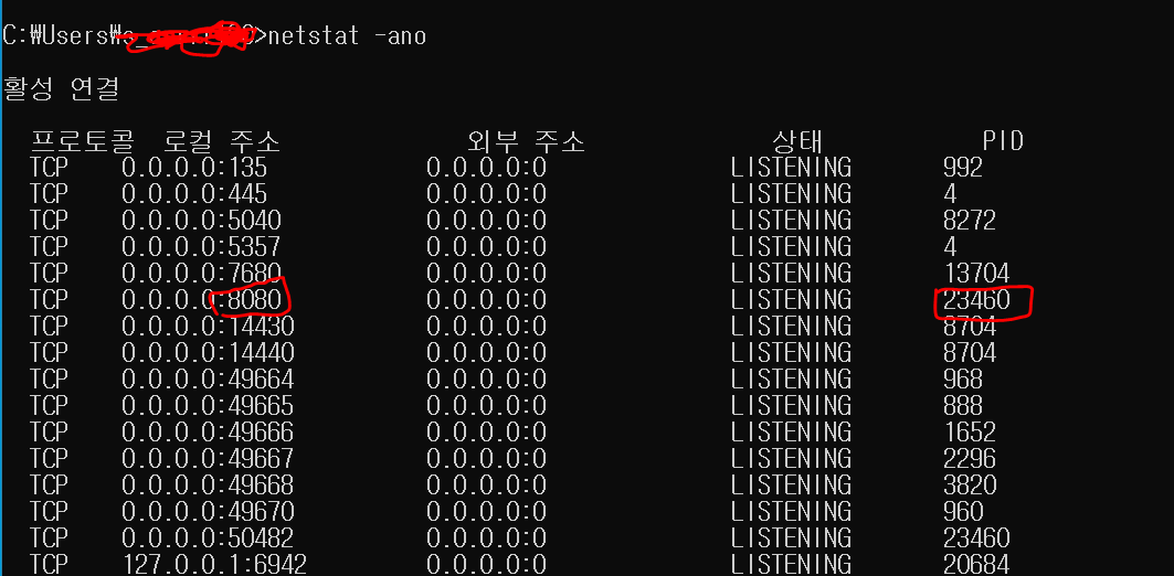 3. 로컬 주소가 8080에 해당하는 pid 숫자를 찾는다.