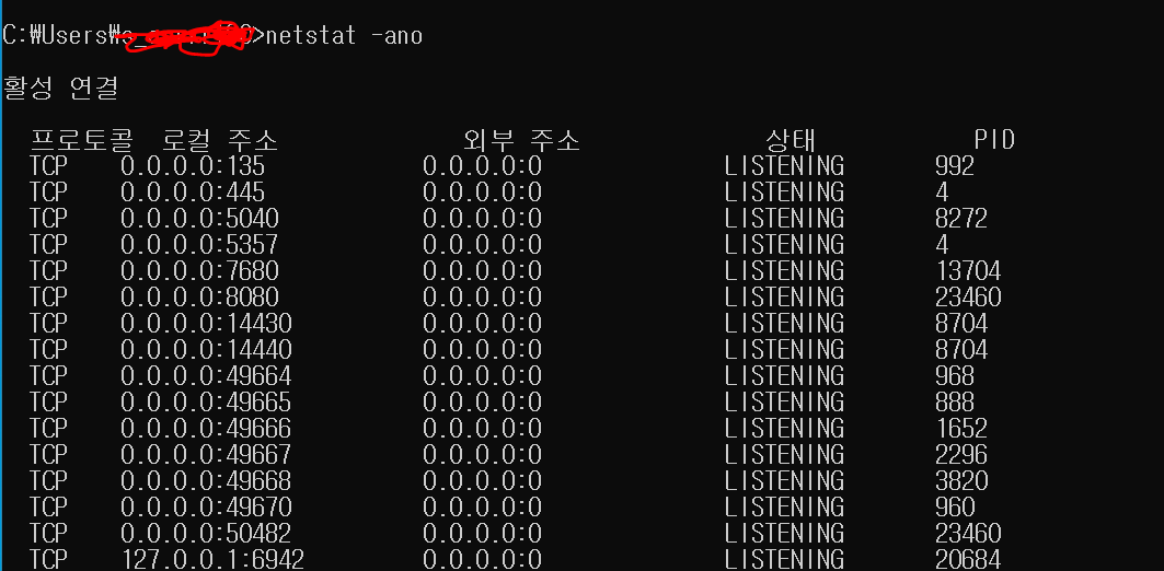 2. 명령 프롬포트 창에 "netstat -ano" 를 입력하면 현재 사용중인 프로세스들이 주르륵 뜬다