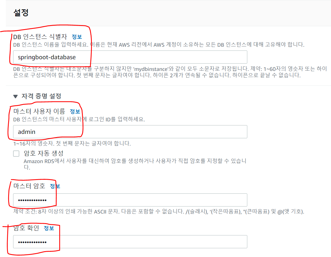 - Password : 데이터베이스 생성할 때 설정한 마스터 암호