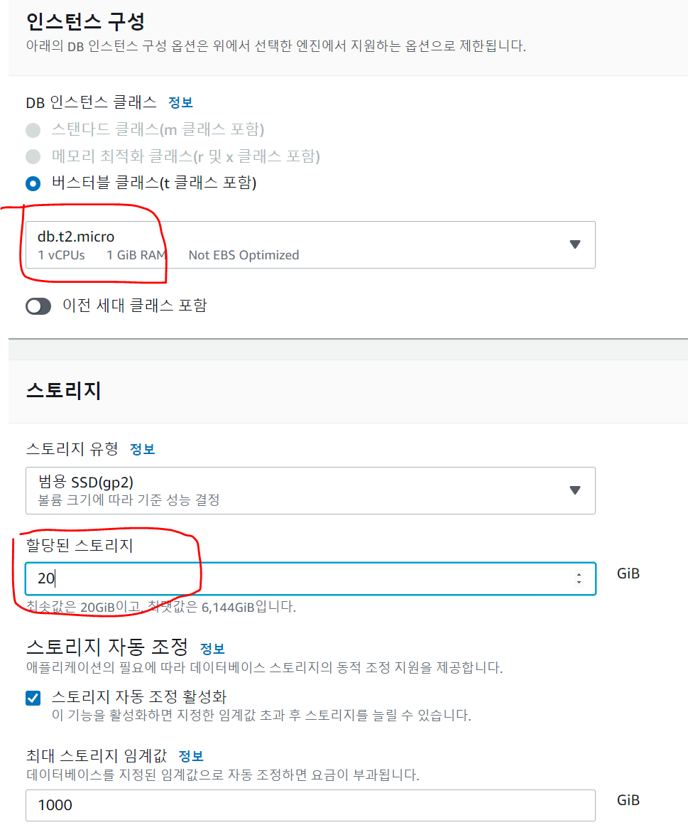 5. 과금방지를 위해 인스턴스는 db.t2.micro로 바꿔주고, 할당된 스토리지는 20으로 해주기