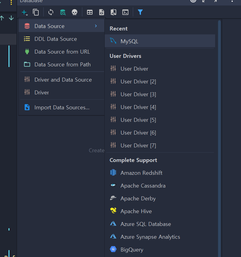 14. intellij 우측에 있는 Database 클릭해서 Data Source > Mysql 클릭하기
